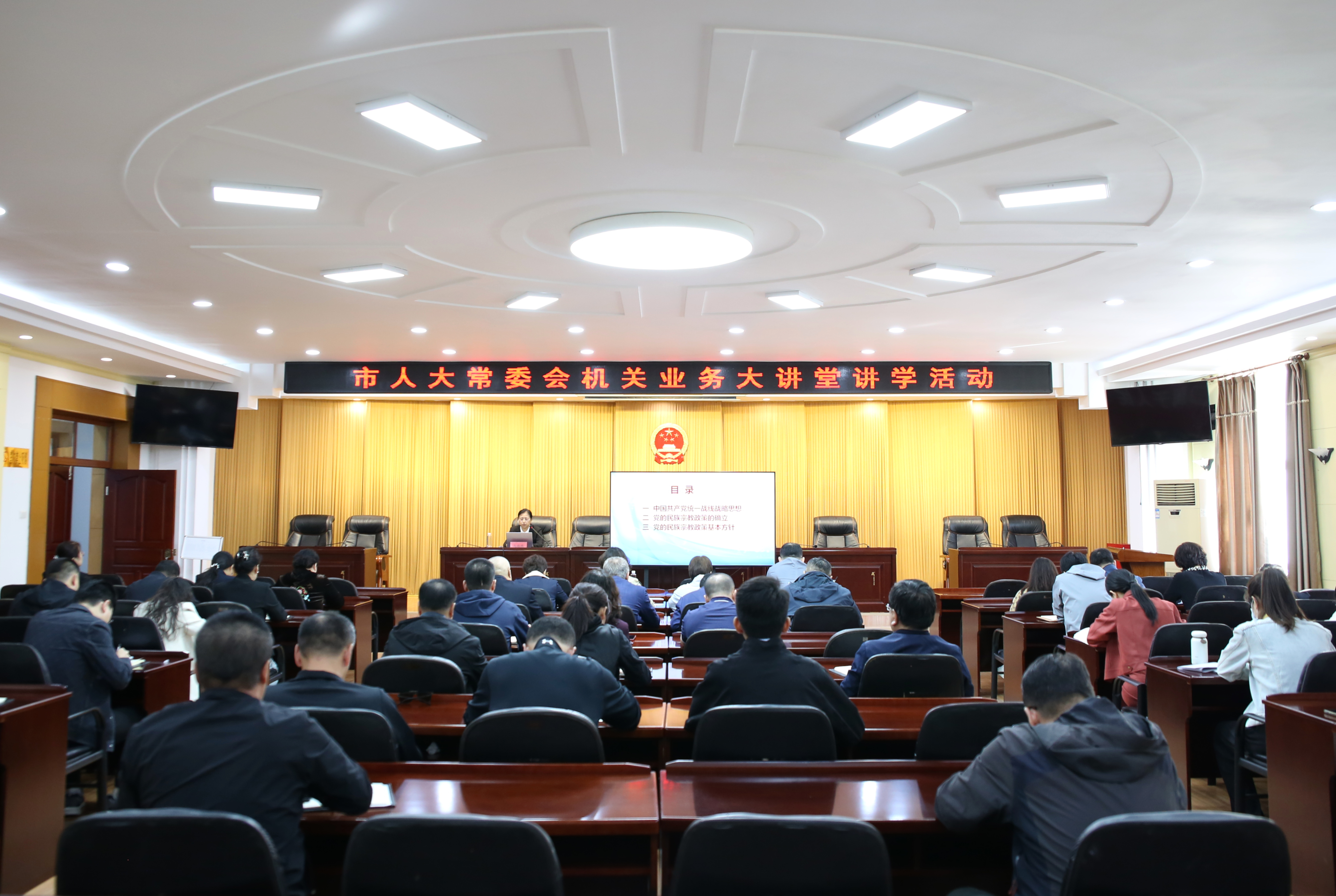 为进一步提升机关党员干部业务理论水平,推进机关深化能力作风建设工作走深走实,9月19日,市人大常委会机关开展“业务大讲堂”讲学活动,市人大民宗侨外委副主任委员马海燕以《我国民族宗教政策的确立和基本方针》为题,为机关全体党员干部授课。