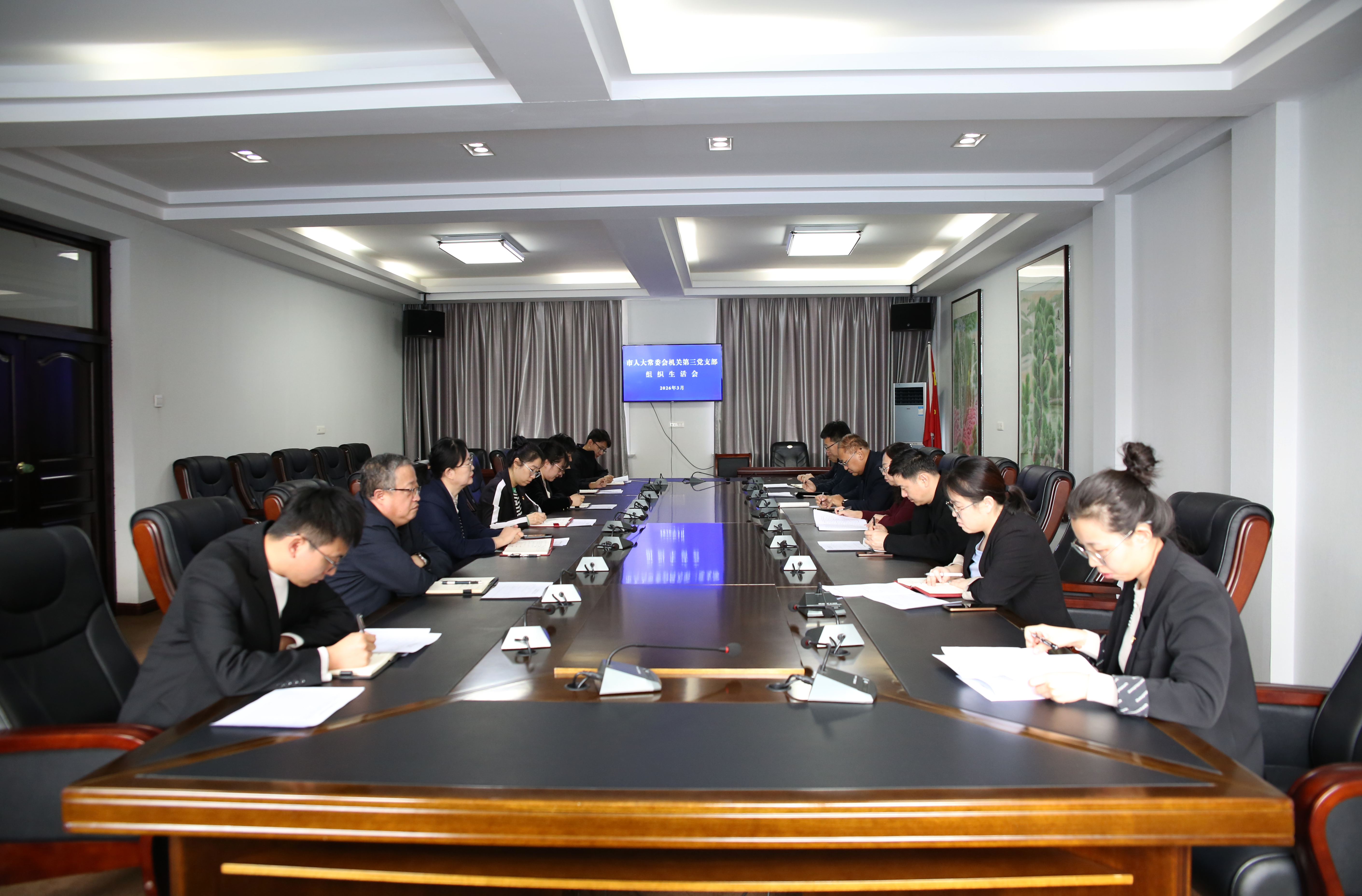 3月26日,市人大常委会机关第四党支部召开2025年度组织生活会。党支部书记王小龙主持会议,市人大常委会机关党委委员列席会议。市人大常委会党组副书记、副主任王晓东以普通党员身份参加会议,带头开展批评和自我批评。会上,党支部书记代表支部委员会总结了2025年度党支部的工作情况,代表支部委员会作对照检查。支部党员逐一进行了自我剖析。会议还同步开展了民主评议党员工作,以无记名投票方式对党员年度表现进行民主测评。