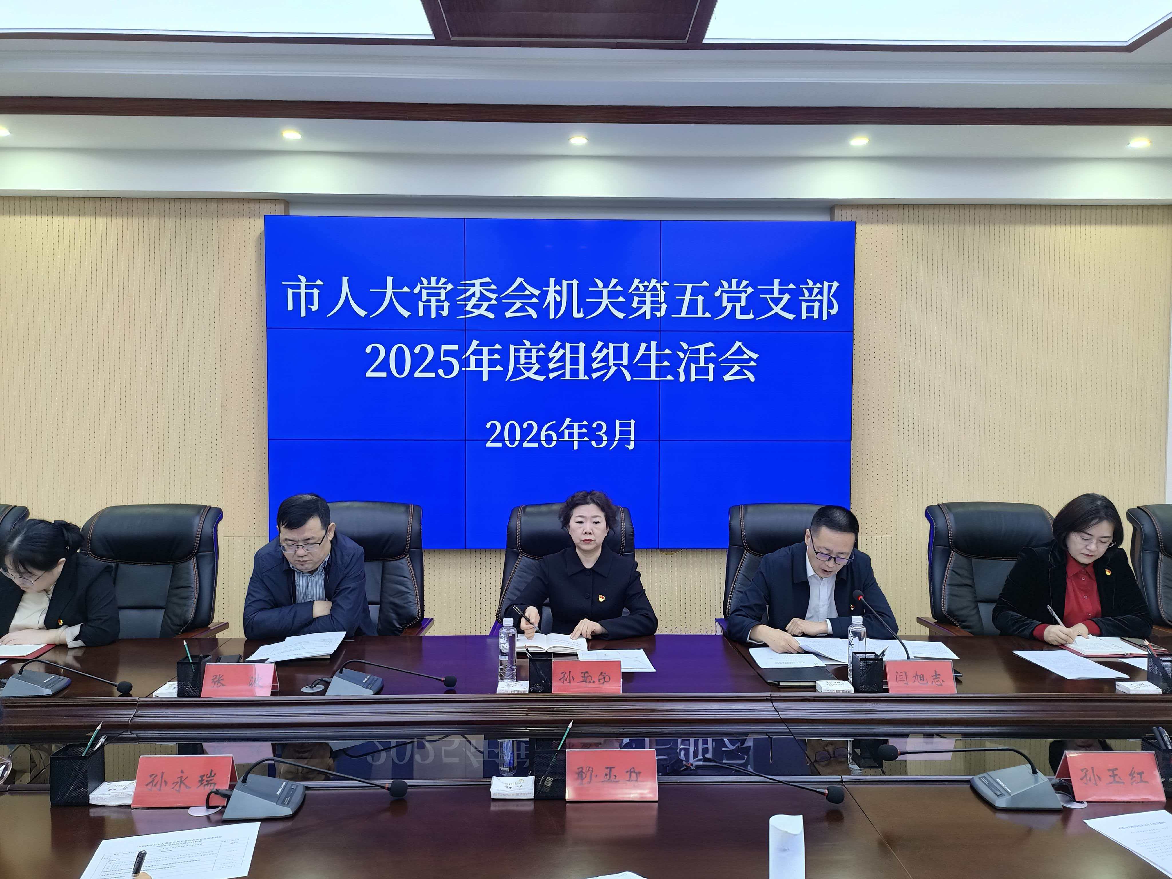 3月17日,市人大常委会机关第五党支部召开2025年度组织生活会。党支部书记闫旭志主持会议,市人大常委会机关党委委员列席会议。市人大常委会党组成员、副主任孙玉玲以普通党员身份参加会议,带头开展批评和自我批评。会上党支部书记代表支部委员会通报了2025年支部工作开展情况,作2025年支部班子对照检查。支部党员围绕“五个带头”、意识形态领域等重点方面内容,依次进行对照检查、互相提出批评意见,真正做到“红脸”、“出汗”。会议严格按照程序组织开展了民主评议党员工作。