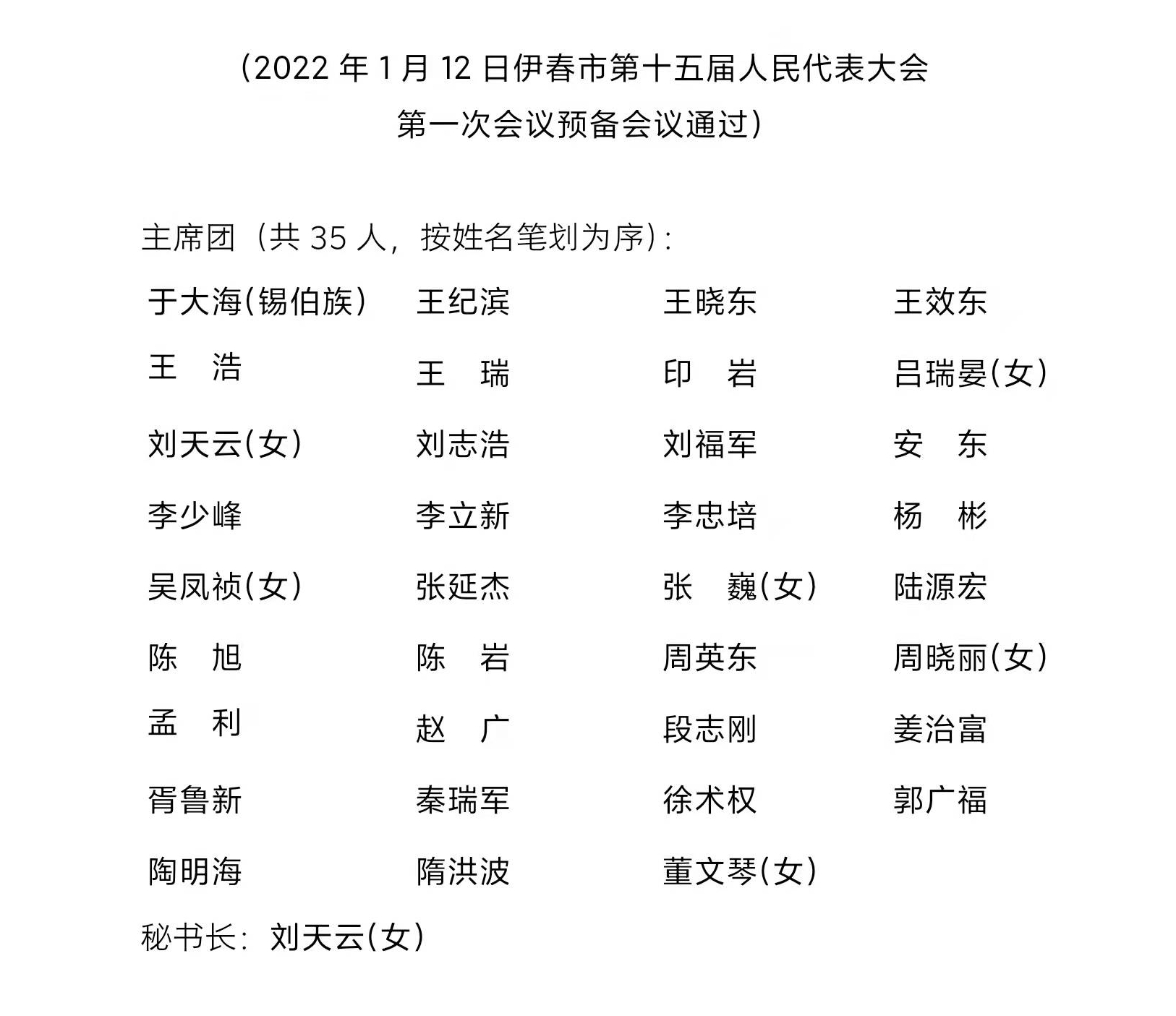 伊春市第十五届人民代表大会第一次会议主席团和秘书长名单